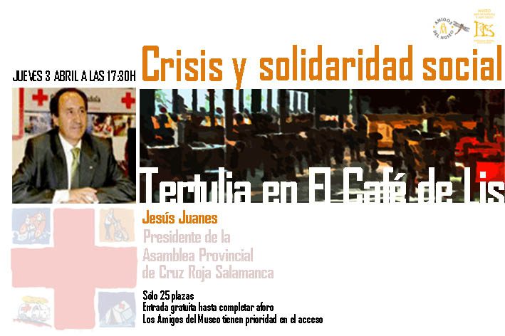 (Jueves, 3 de abril de 2014) El Café de Lis del Museo Art Nouveau y Art Déco acogerá la tertulia “Crisis y solidaridad social” con D. Jesús Juanes, Presidente de la Asamblea Provincial de la Cruz Roja, el jueves 3 de abril a las 17:30 horas. Esta actividad organizada por la Asociación de Amigos del Museo es de acceso libre y gratuito, si bien los Amigos del Museo que se acrediten, tendrán prioridad para participar en ella.